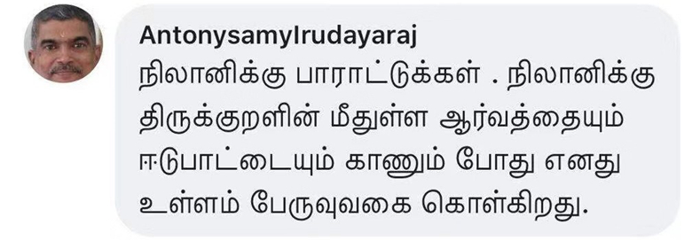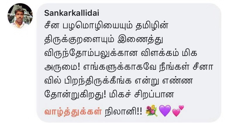 “通过《平‘语’近人》,我更加确认了中国和印度源远流长的文化交流。《论语》和《古腊箴言》是两大古文明的瑰宝,它们中奇妙的联系冥冥之中在中印人民心中种下了友谊的种子。我确信了中国文化和泰米尔文化有着共通之处,可以互相理解。”