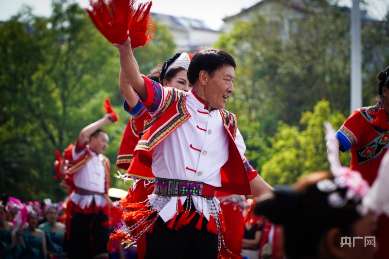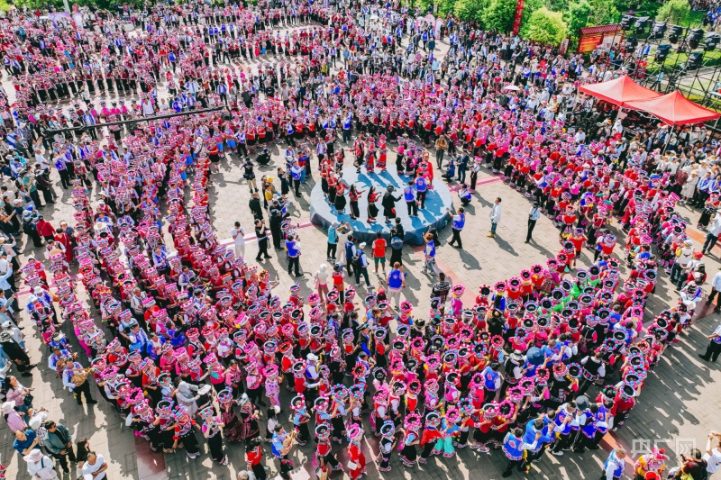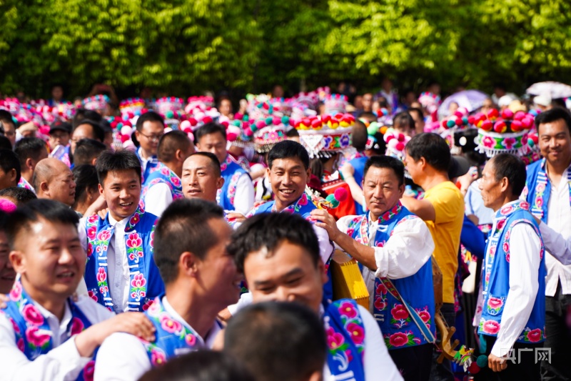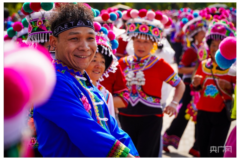 当日上午10时许,在牟定县化湖广场,上万名身着彝族盛装的群众围成无数“同心圆”,唱着左脚调跳起左脚舞。广场上开满了“马缨花”,那是盛装的彝家女子头上的双花球,随着“咚咚”的左脚舞步,热烈地摇摆在立夏的风中。