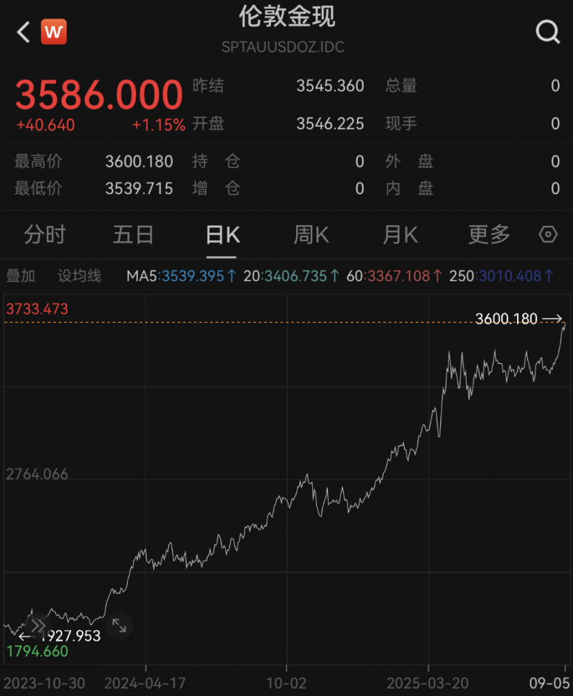 受此影响,现货黄金价格持续走强,美东时间9月5日一度突破3600美元/盎司,创出历史新高。