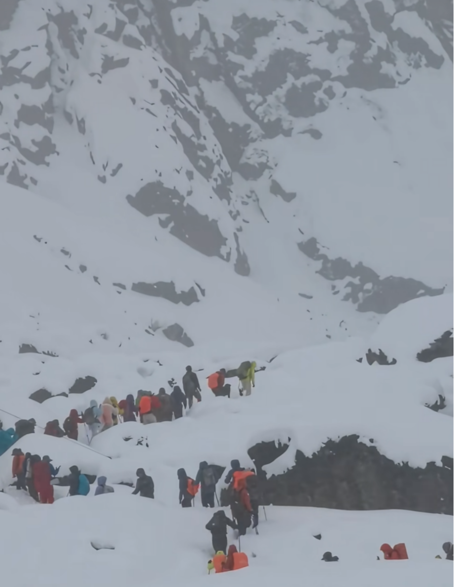 更严峻的是,外部救援难以抵达。“村支书在电话里说‘你们原地等待,救援队明天才能进山’,但我知道,5000米的海拔,潮湿寒冷的环境,再等下去可能有人出现肺水肿或脑水肿。”舒微与其他领队商议后,决定天亮后自行撤离。10月5日清晨8点,雪暂时停了,但营地积雪最深处已达1.2米。舒微带领5名领队率先开路,他走在最前面,每一步都要用力踩实,防止陷入雪洞。“有一次我踩空了,整个人陷到胸口,队友拉了我好几次才把我拽出来,羽绒服里全是雪,冻得我直打冷战。”