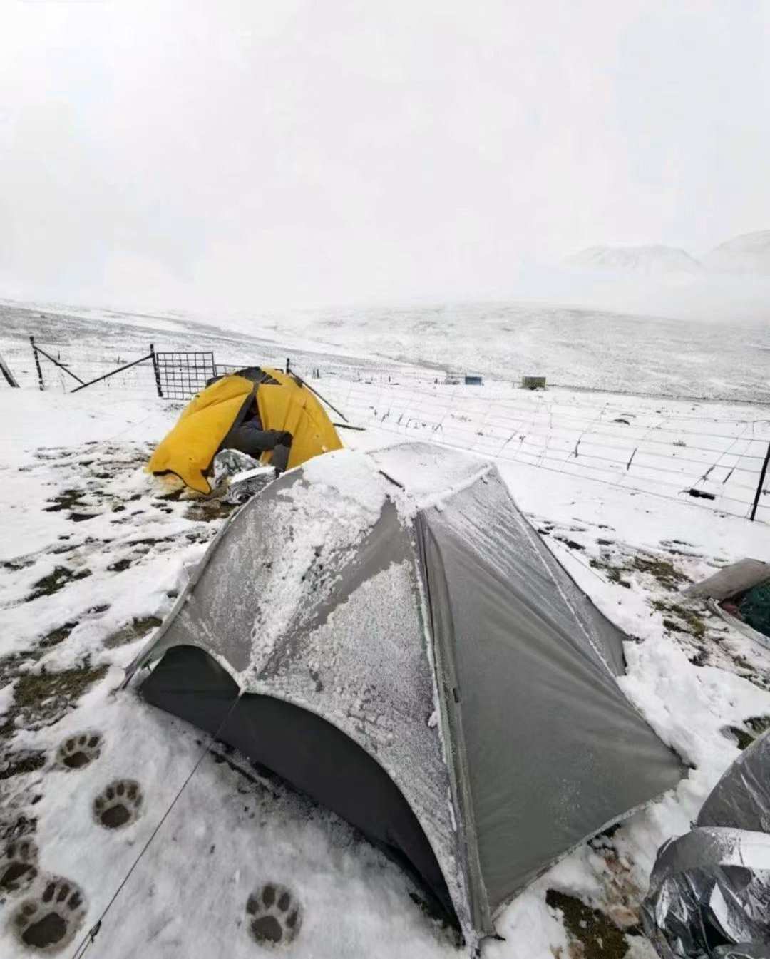 10月4日12点,暴雪突袭。“刚开始是小雪花,不到半小时就变成鹅毛大雪,能见度不足5米。”舒微立刻让队员停止前进,返回俄嘎营地躲避。但积雪增长速度远超预期,当晚8点,营地积雪已没过膝盖,三人帐篷被积雪压得严重变形。“我们每隔15至20分钟就要出去抖一次雪,不然帐篷会被压塌。有个队员的帐篷杆断了,我们只能把他转移到其他帐篷。”