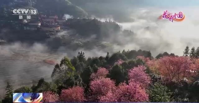福建南靖田螺坑土楼群的樱花眼下也正迎春吐艳。从空中俯瞰,云雾中一排排、一片片的樱花若隐若现,与古香古色的土楼交相辉映,分外好看,勾勒出一幅清新雅致的田园春景图。