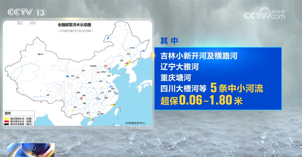 央视网消息:7月21日,水利部滚动会商研判全国雨水情形势,7月20日8时至21日8时,受台风“韦帕”影响,吉林浑江支流小新开河、横路河、辽宁浑江支流大雅河、重庆长江上游塘河、四川塘河支流大槽河、福建敖江、广东雷州半岛公和水、广西桂南沿海南流江支流江宁河、云南元江支流化念河等20条中小河流发生超警以上洪水,最大超警幅度3.86米,其中吉林小新开河及横路河、辽宁大雅河、重庆塘河、四川大槽河等5条中小河流超保0.06—1.80米。