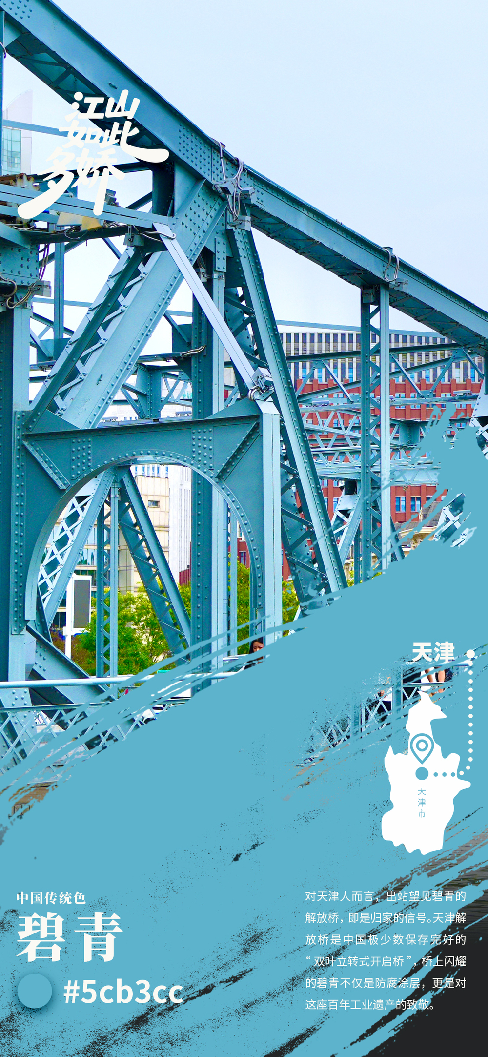站在碧青色的解放桥,脚下是海河汩汩流淌,作为中国唯一的双叶立转式开启桥,解放桥在海河上矗立了近百年。每逢重大节假日,解放桥“盛装”开启扮靓津城,已经成为独具特色的城市名片。