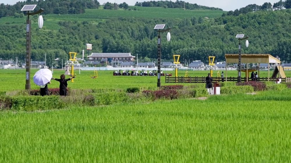 朝鲜族民居改造成的民宿别具特色,屋檐下的辣椒串在阳光下格外鲜艳。体验工坊里,游客们认真学习制作传统美食,空气中弥漫着米香与欢笑。