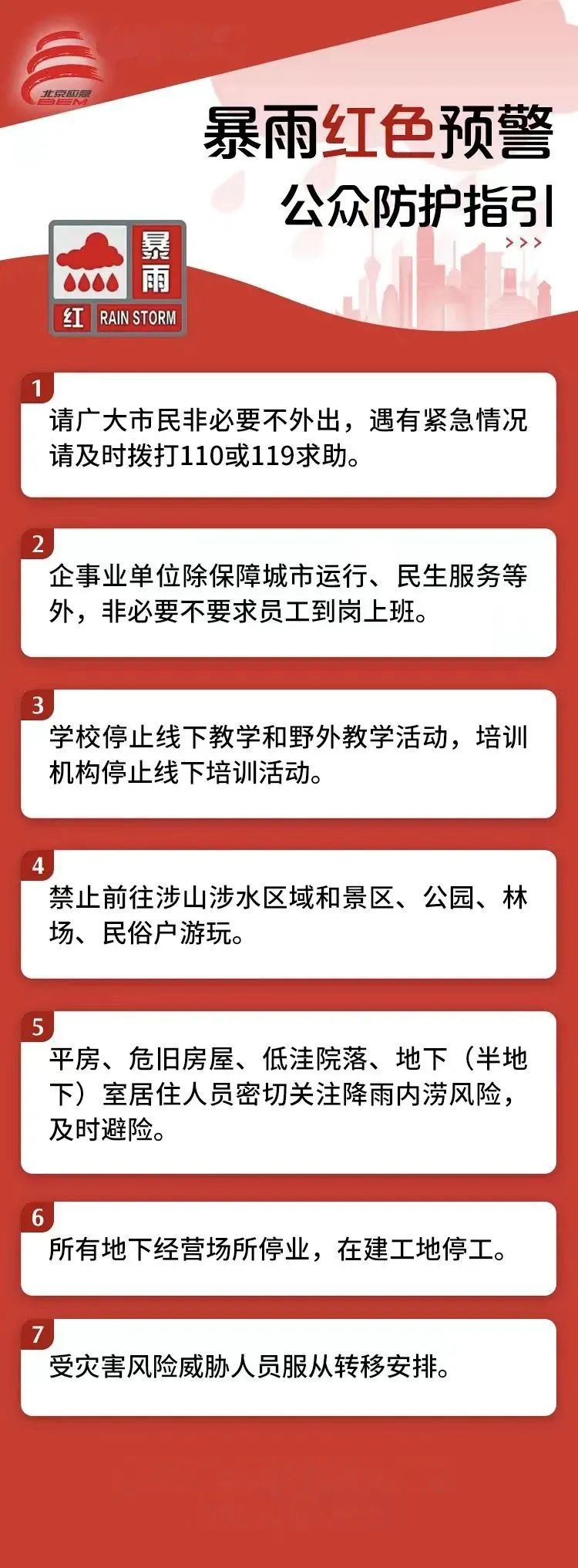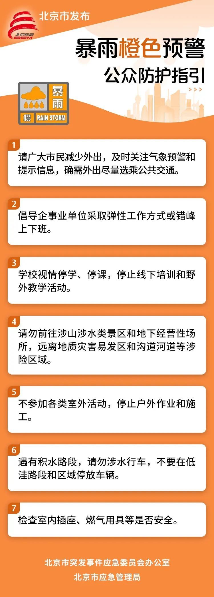 北京市气象台8月4日9时10分发布暴雨橙色预警信号:预计8月4日12时至5日8时,大部分地区将出现1小时雨量70毫米或6小时雨量100毫米以上的强降水,其中,房山、门头沟、石景山等区的部分地区6小时降雨量可达150毫米以上,个别点200毫米以上。目前,北京丰台区、房山区、门头沟区、石景山区、怀柔区、昌平区已升级发布暴雨红色预警。房山、门头沟、丰台、石景山、海淀、昌平、怀柔、密云、平谷等部分区域处于地质灾害预警当中。根据《北京市防汛应急预案》及市防汛指挥部要求,请各单位积极做好本次降雨应对防范工作,现就有关事项通知如下: