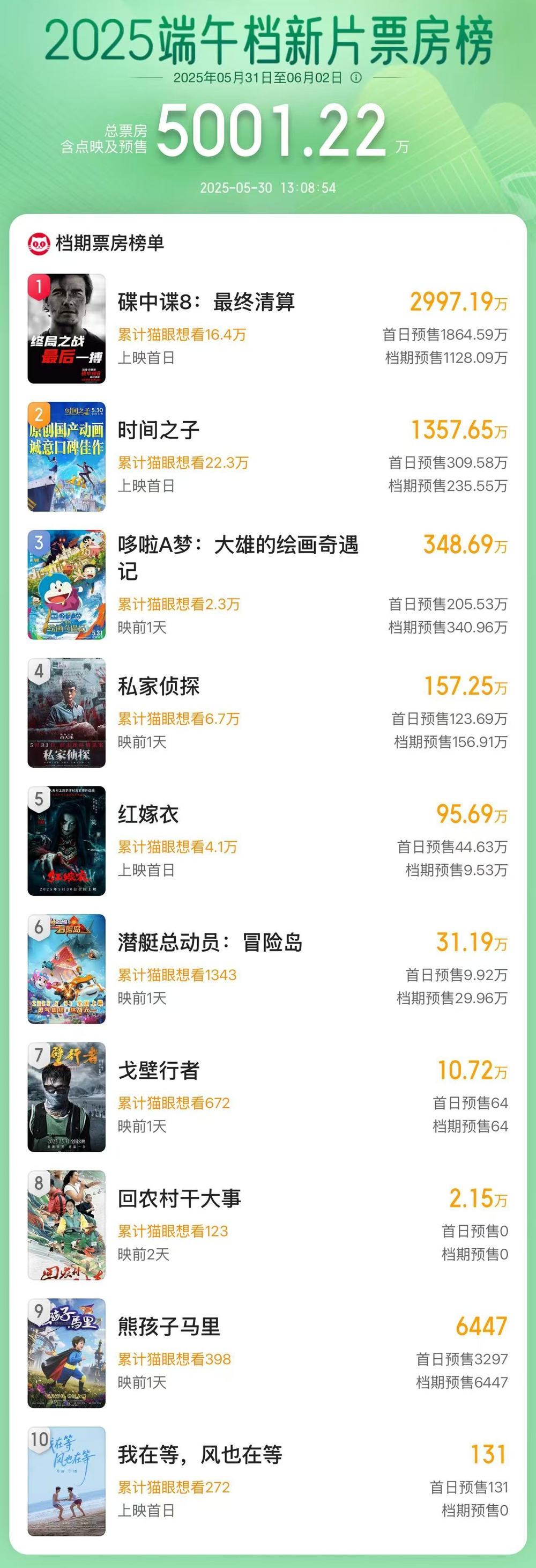 据网络平台数据,截至5月30日13时08分,2025年端午档新片预售总票房(含点映)破5000万,《碟中谍8:最终清算》领跑2025年端午档新片预售票房榜。