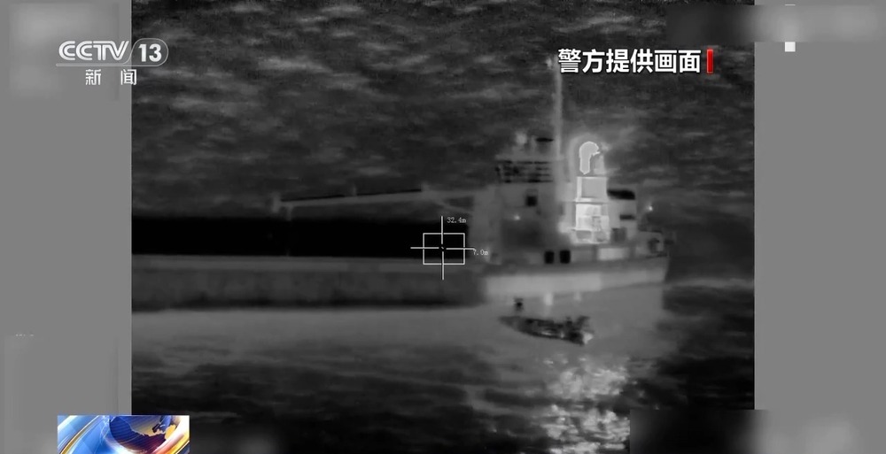 随后,海警执法员通过大量工作,最终锁定这艘形迹可疑的货船。8月4日,专案组派遣三艘舰艇连续航行32小时,无人机在高空锁定目标。