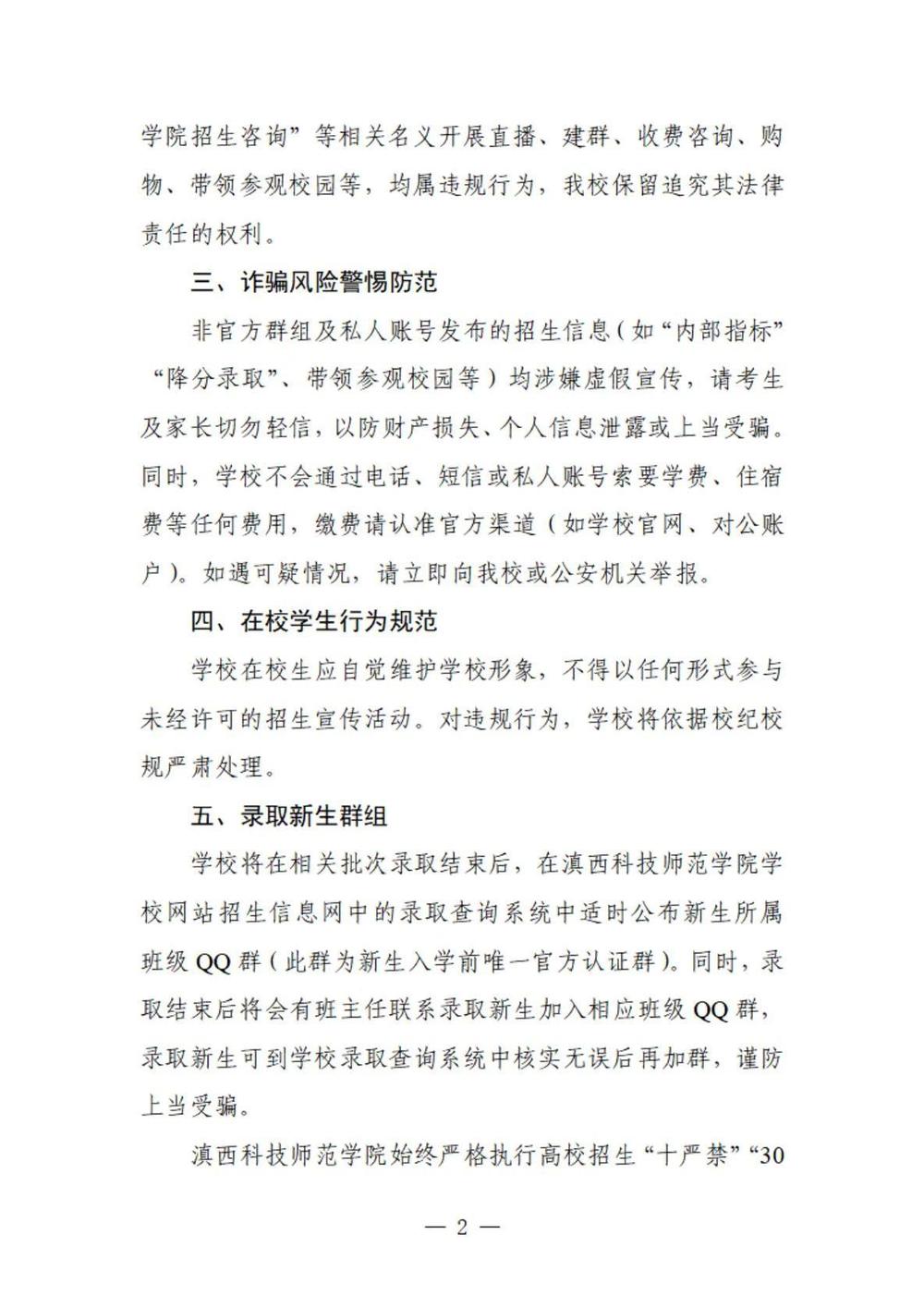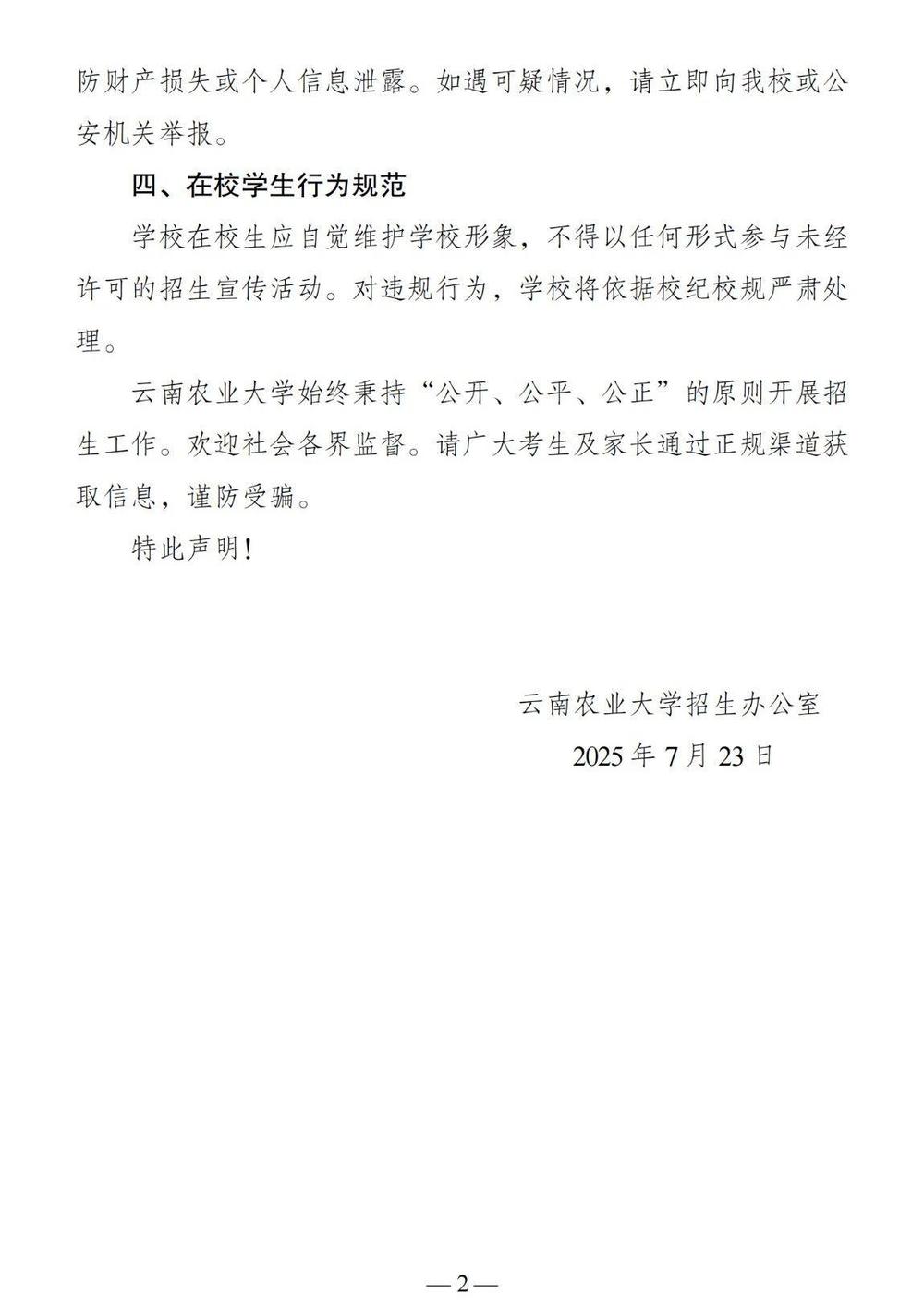 目前,云南省2025年普通高校招生录取工作正在进行中。7月23日,云南农业大学、滇西科技师范学院发表声明称,学校近期发现部分人员在网络平台传播非官方招生答疑信息,此类行为可能误导考生及家长,存在信息泄露和诈骗风险。