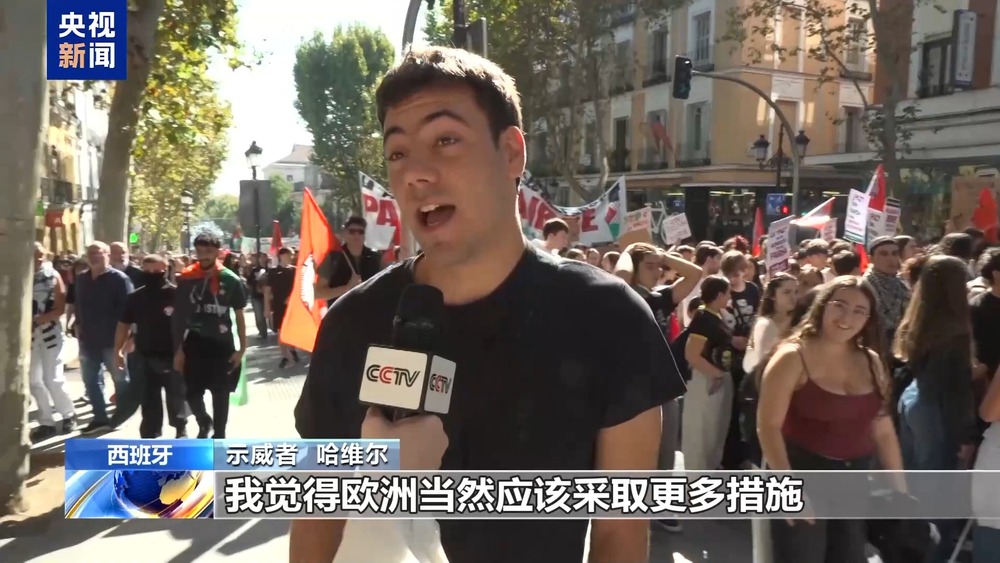 示威者 哈维尔:我觉得欧洲当然应该采取更多措施。目前他们仍在(和以色列)做买卖,为种族灭绝提供着资金。现在必须要采取更多的行动。