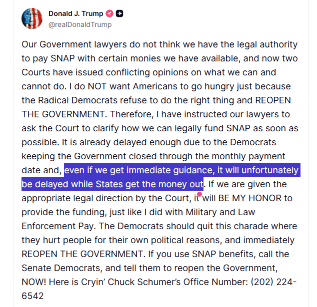 在10月25日,美国农业部在其官网发布声明,证实美国政府不会在“补充营养援助计划”资金耗尽后提供额外的资金补充。对此,美国25个民主党领导的州及华盛顿特区组成的联盟于10月28日提起诉讼,要求特朗普政府恢复该项目。在10月31日,美国联邦法官裁定,特朗普政府必须动用应急资金支持“补充营养援助计划”,为低收入人群提供食品券。